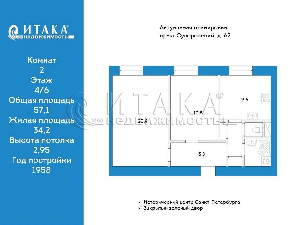 Предлагаем Вашему вниманию великолепную 2-комнатную квартиру в роскошном сталинском доме на углу Суворовского проспекта и площади Пролетарской Диктатуры. Элитное расположение в историческом центре, в шаге от Смольного собора и набережной Невы. Аутентичная архитектура с высокими потолками, панорамными окнами и видом на здание Правительства Ленинградской области.Кирпичный дом 1958 года постройки, чистая ухоженная парадная, установлен лифт OTIS.Квартира общей площадью 57,1 кв. м. Две изолированные комнаты: парадная гостиная 20,4 кв. м. и уютная спальня 13,8 кв. м. с кондиционером, просторная кухня 9.6 кв. м., широкий коридор, 2 встроенные кладовки и раздельный санузел. Высота потолка в квартире 2,95 м. Комфортный 4 этаж, закрытый зелёный двор.Квартира без ограничений и обременений.Собственность более 5 лет, полная стоимость в договоре, подходит под ипотеку, быстрый выход на сделку.Для получения дополнительной информации и организации просмотра просим обращаться по телефону. Спешите, подобные лоты появляются крайне редко.