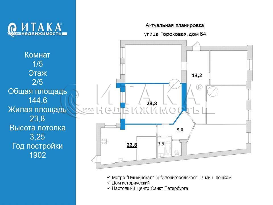 Предлагается к покупке отличная комната в отличной квартире. Комната 23,8 кв.м., удобной геометрии с двумя окнами. В квартире еще 3 комнаты, из которых две в собственности у одной проживающей, 4-я комната принадлежит собственнику, в которой она и проживает. 5-ая комната муниципальная. Квартира содержится в чистоте, в коридоре и на кухне у каждого выделены свои места, ванная комната большая, поэтому 3 стиральные машины (каждого собственника) там установлены. Вход в подъезд со двора, двор закрыт. Окна комнаты выходят в достаточно просторный светлый двор. Дом исторический 1902 года постройки. Отличная локация, одно из преимуществ - равно удалённость (7 минут от ст. метро Пушкинская и Звенигородская). Настоящий центр Санкт Петербурга. Об этом доме можно много рассказывать интересного, но моя задача заинтересовать Вас покупкой этой комнаты. Преимуществ у нее много .Высота потолка 3.25 . Звоните, расскажем и покажем.