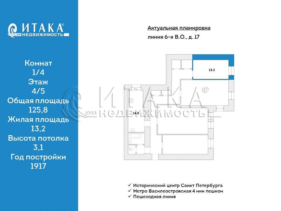 Продается уютная комната 13,2 кв. м правильной формы в 4-х к квартире в историческом центре на 6 пешеходной линии Васильевского Острова в шаговой доступности от метро Василеостровская (3 минуты пешком). Комната расположена на 3 этаже, из окон открывается прекрасный вид на Собор Собор Святого Апостола Андрея Первозванного и на Петербургские крыши. В комнате хороший паркет. При входе в комнату также есть небольшой коридорчик и кладовка площадью около 3 м, которую можно использовать как гардеробную. Они находятся в распоряжении собственника. Площадь кухни 14 кв. м. В подъезде имеется лифт. Высота потолков 3,1 м. Капитальный ремонт дома производился в 1980, общее состояние квартиры хорошее, перекрытия железобетонные. Подъезд и фасад дома ухоженные, с ремонтом. В квартире горячее водоснабжение, центральное отопление и газовая плита. Соседи спокойные, квартира очень тихая, комната расположена в самом конце квартиры, что создает изолированность ее от мест общего пользования. Проживают как собственники, так и арендаторы. Возможно сдача в аренду.