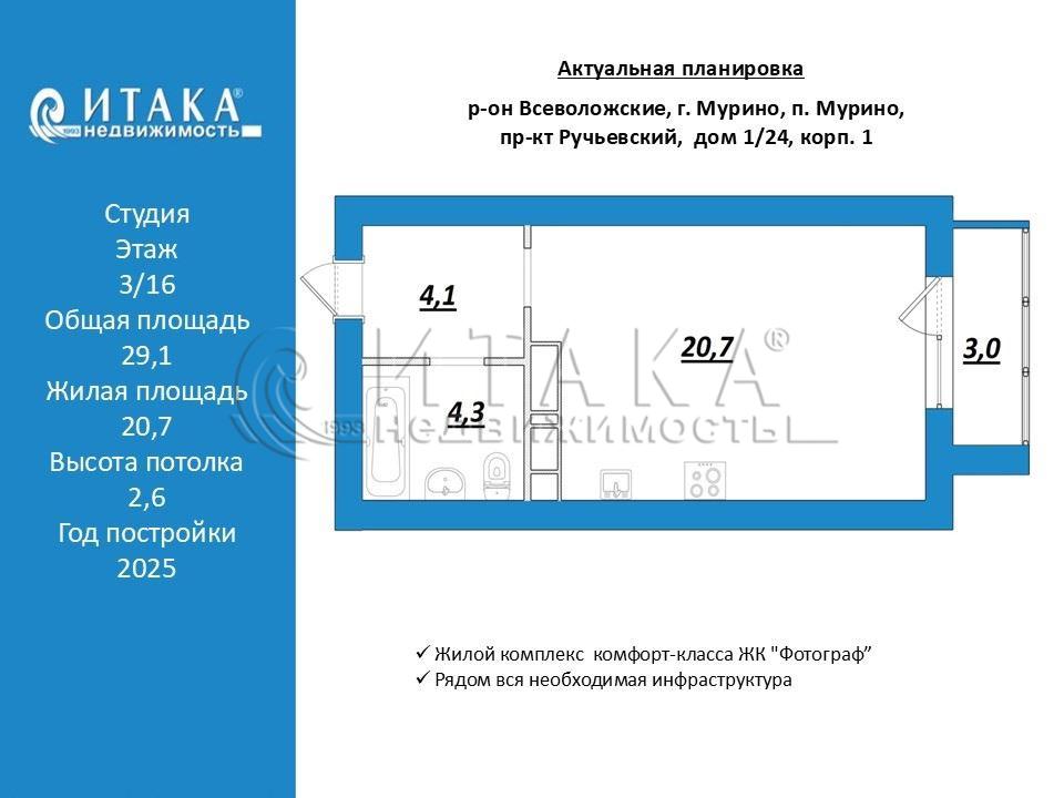 Продам квартиру студию в жилом комплексе комфорт-класса ЖК "Фотограф". Дом сдан, квартира в собственности, значит Вы сразу можете приступить к обустройству своего нового жилья. Квартира расположена на комфортном 3-м этаже с видом во двор, на уютный зеленый и благоустроенный двор с зоной отдыха , качелями и видеонаблюдением.Общая площадь студии 29,1 кв.м. застекленная лоджия 3 кв.м., В квартире установлена хорошая железная дверь, выполнен монтаж электропроводки с установкой электросчетчика, сделана подводка для подключения сантехники и установлены счетчики ГВС и ХВС, теплосчётчик на батареях , полотенцесушитель в санузле.Вся инфраструктура под рукой, на первом этаже комплекса расположены коммерческие помещения, аптеки,магазины, отдел вселения. салоны красоты, кафе.Квартира подходит под любую форму оплаты, полна стоимость в договоре. Звоните с удовольствие все подробно расскажу и покажу.Итака. Работаем с 1993 года.