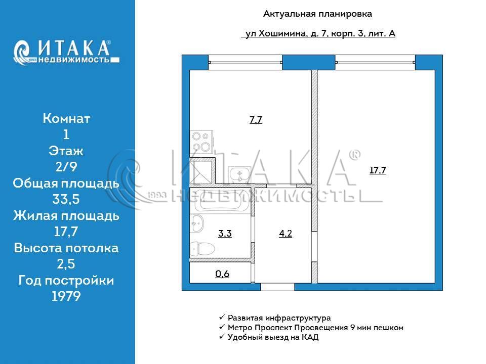 Общая площадь: 33.5 м2