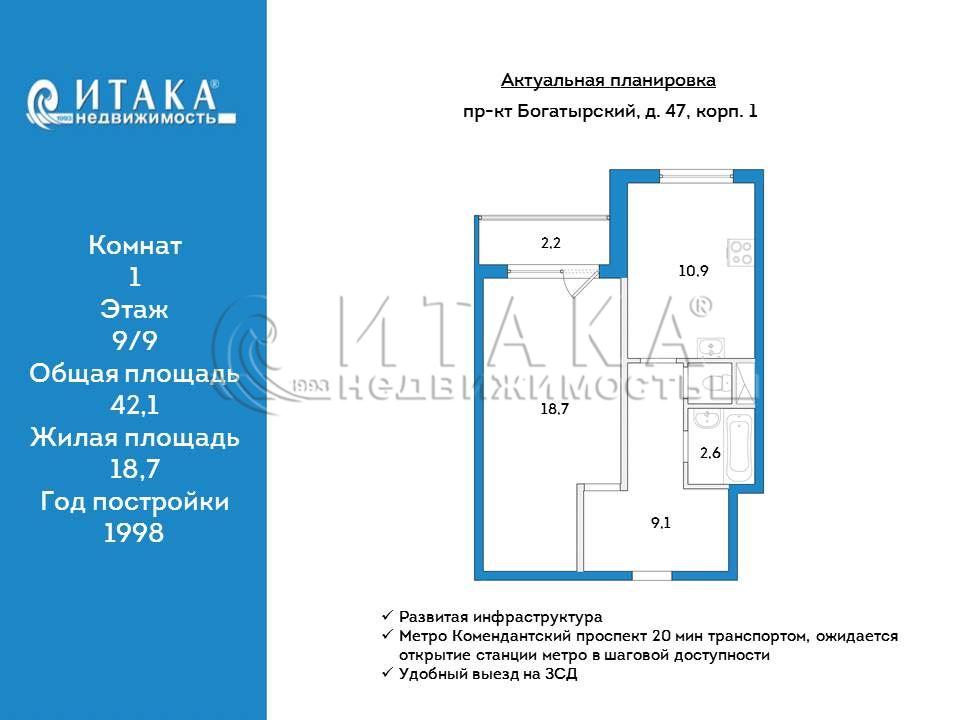 Продается 1-комнатная квартира 42 кв.м. с хорошим ремонтом в Приморском районе!Идеальный вариант для комфортной жизни, инвестиции или первой собственной квартиры!Просторная планировка с изолированной комнатой 18.70 кв.м. и уютной кухней 10.9 кв.м. Теплый дом, с прекрасной шумоизоляцией.Квартира полностью готова к проживанию. Сделан качественный ремонт (выровнены стены, пол, сделана шумоизоляция, заменена электропроводка, радиаторы, стеклопакеты). Мебель Landl, плита Hansa, сантехника и плитка Италия. Лоджия застеклена. В квартире подключена сигнализация (после покупки можно расторгнуть договор). Чистое право собственности: Первая продажа с момента постройки дома в 1998 года. Ответственный собственник без долгов. В объекте нет перепланировок и обременений. Дополнительные преимущества дома - дом управляется ТСЖ, низкие коммунальные платежи и качественное содержание имущества. Спокойная атмосфера - доброжелательные соседи, многие из которых живут здесь со времен постройки. Великолепная локация. Все самое необходимое - прямо у дома: напротив гипермаркет ОКей для ежедневных покупок, в соседних домах есть продовольственные магазины и с товарами для ремонта. Пункты выдачи с маркетплейсов. В шаговой доступности: школы и детские сады, поликлиники (взрослая и детская), почта, отделения банков, кафе и рестораны, библиотека. Тихий, зеленый двор с очень просторной детской площадкой.Отличная транспортная доступность. Ближайшее метро всего в 20 минутах на транспорте или 30 минут пешком до ст.м.Комендантский проспект. Так же можно доехать за полчаса до м.Пионерская или Старая Деревня. В перспективе через несколько лет откроется станция метро "Богатырская" (по "зеленой" ветке), что значительно увеличит ликвидность квартиры!Прямая продажа!