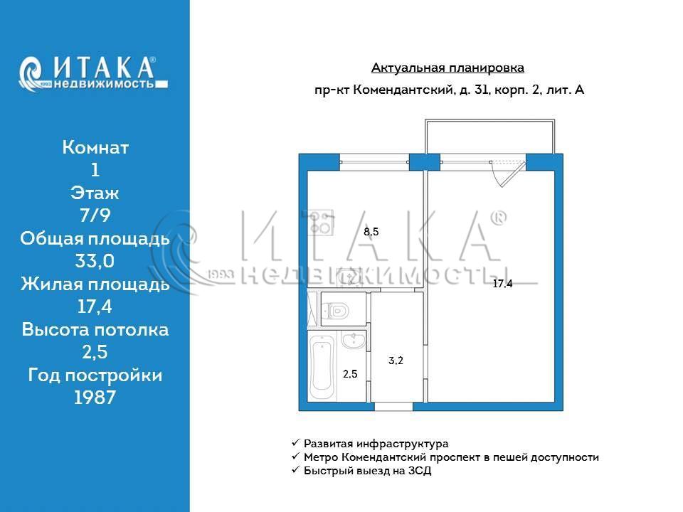 ВНЕСЕН АВАНС!!!Предлагаем к покупке 1 комнатную квартиру в активно развивающемся, зелёном Приморском районе!***Квартира общей площадью 33 кв.м без учёта площади балкона 2,7 кв.м., расположенная на 7 этаже***Хорошая планировка: жилая комната 17,4 кв.м, что делает возможным её зонирование, кухня- 8,2 кв.м. квадратной формы. полноценная прихожая и раздельный СУ с ванной и местом под стиральную машинуКвартира светлая, окна выходят на южную сторону, что безусловно огромное преимущество для хмурого Питера.Квартира желает косметического ремонта. Перепланировок нет.ПРО ДОКУМЕНТЫ** 1 взрослый собственник, владеет по договору купли-продажи более 20 лет** Полное юридическое сопровождение сделки под ключПРО ИНФРАСТРУКТУРУ***Дом 1987 года постройки, 606 серии, благоустроенный двор с зонами отдыха и детскими площадками, озеленение и выделенные зоны парковки***Качественный ремонт в доме: Обновленная парадная. Новый лифт. Видеонаблюдение. Доброжелательные соседи.***Полная инфраструктура Приморского района, вокруг есть всё необходимое: магазины, школа, сад, МФЦ, поликлиника - всё в пешей доступности***Идеальная транспортная доступность: пешая доступность от метро "Комендантский проспект", всего 10-15 минут на транспорте до метро "Пионерская" и ст. Деревня, остановки общественного транспорта у дома.Инвестиционно привлекательный район, в ближайшем будущем (строительство уже ведется) открытие метро Яхтенная (5 мин пешком).Звоните! Готовы ответить на ваши вопросы и договориться о просмотре.