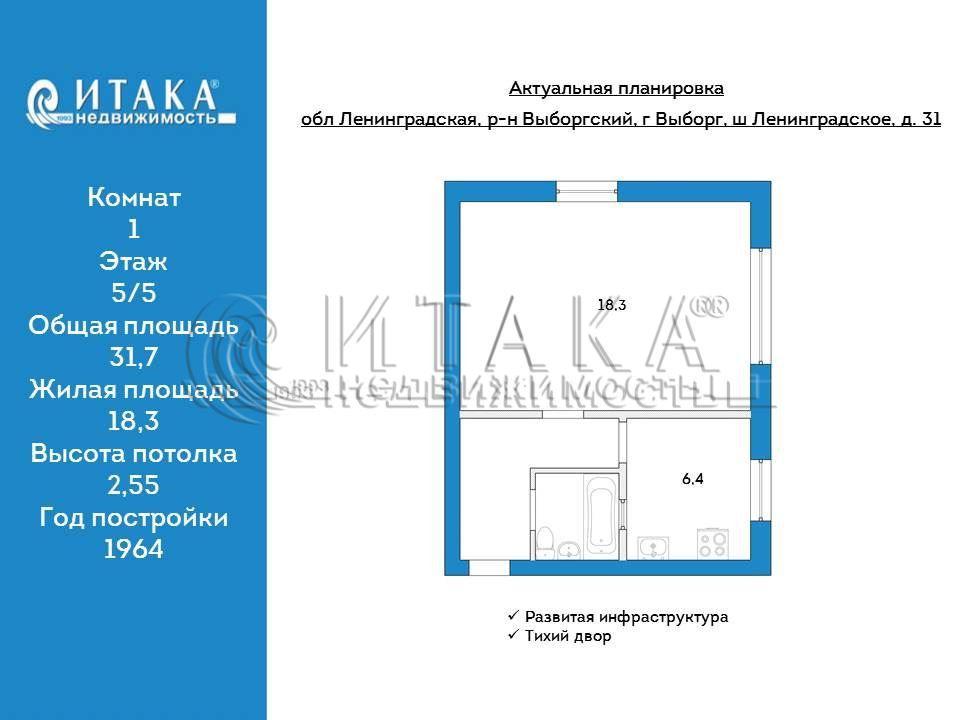 128654539 Продаётся уютная однокомнатная квартира площадью 31.7 квадратных метров на пятом этаже пятиэтажного кирпичного дома, расположенного по адресу: г. Выборг, Центральный микрорайон, Ленинградское шоссе, 31. Жилая площадь составляет 18.3 квадратных метров, кухня – 6.4 квадратных метров. Квартира привлекательна своим местом положения, как для небольшой семьи так и для сдачи в аренду. Вся инфраструктура города в шаговой доступности.Из окон открывается приятный вид на тихий двор, где расположены детская и спортивная площадки, что особенно ценно для семей с детьми и тех, кто ведет активный образ жизни.Район обладает развитой инфраструктурой: рядом находятся школа, детский сад №11, торговый центр для удобных покупок, парк для прогулок на свежем воздухе и фитнес-центр для поддержания физической формы. Для повседневных покупок поблизости расположены супермаркеты «Магнит» и продуктовый магазин «В Черемушках», а также аптеки «Невис».Приобретая эту квартиру, вы получаете комфортное и функциональное пространство для жизни в приятном районе с необходимыми объектами инфраструктуры неподалеку. Приглашаем на просмотр вашей будущей квартиры!Итака. Работаем с 1993 года.