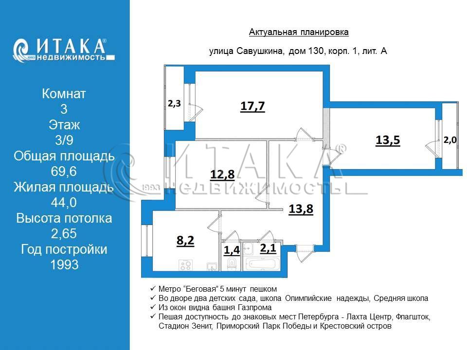 Продается 3 к. квартира в 4-х минутах от станции метро Беговая.Квартира с отделкой и мебелью.Все комнаты раздельные, просторная прихожая, две лоджии, кухня квадратной формы.Санузел раздельный, на полу и стенах кафель. В комнатах полы паркет.Окна во двор и на улицу.Из окон видна башня Газпрома.Дом удачно расположен - во дворе два детских сада, школа Олимпийские надежды, Средняя школа № 683.Около дома Перекресток, в 5 минутах ТРК Меркурий, Атлантик Сити.Парк 300 -летия Санкт-Петербурга расположенный вдоль побережья Финского залива с песчаным пляжем.Пешая доступность до знаковых мест Петербурга - Лахта Центр, Флагшток, Стадион Зенит, Приморский Парк Победы и Крестовский остров через Яхтенный мост.Один собственник, простая встречная покупка. Звоните, покажем квартиру.
